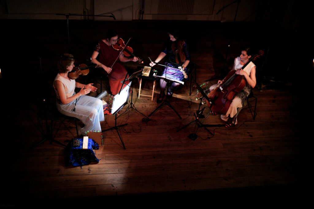 Luna Quartet at KlankKleurFestival Amsterdam, June 2025 (photos by Ben Bonouvrier, playing string quartets by Frank Denyer, costume design by Jellantsje de Vries):